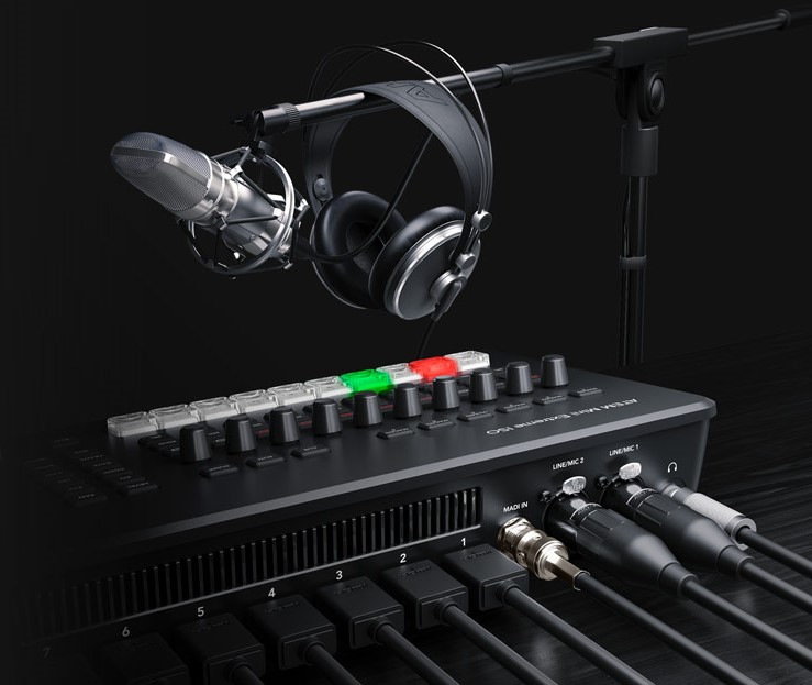 Todas las entradas de audio del ATEM Mini Extreme ISO G2 incluyen botones de control directo en el panel, para ajustar el nivel de audio y habilitar las entradas en la mesa de mezclas. El ATEM Mini Extreme ISO G2 también incluye una salida de auriculares.